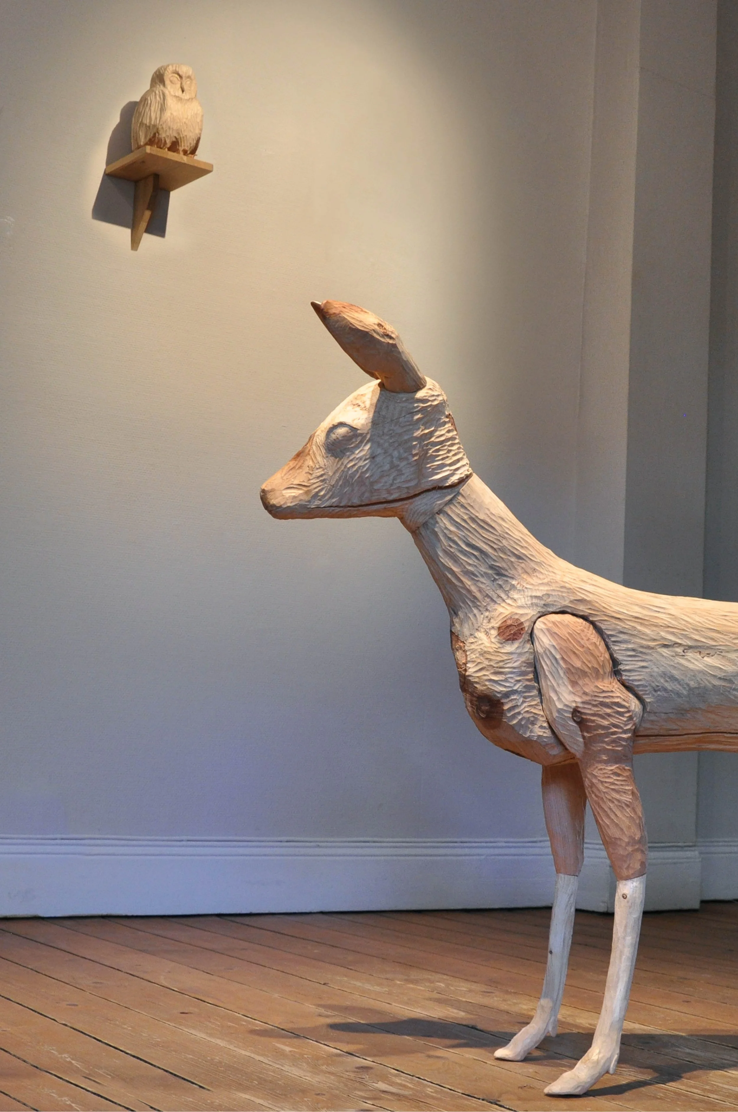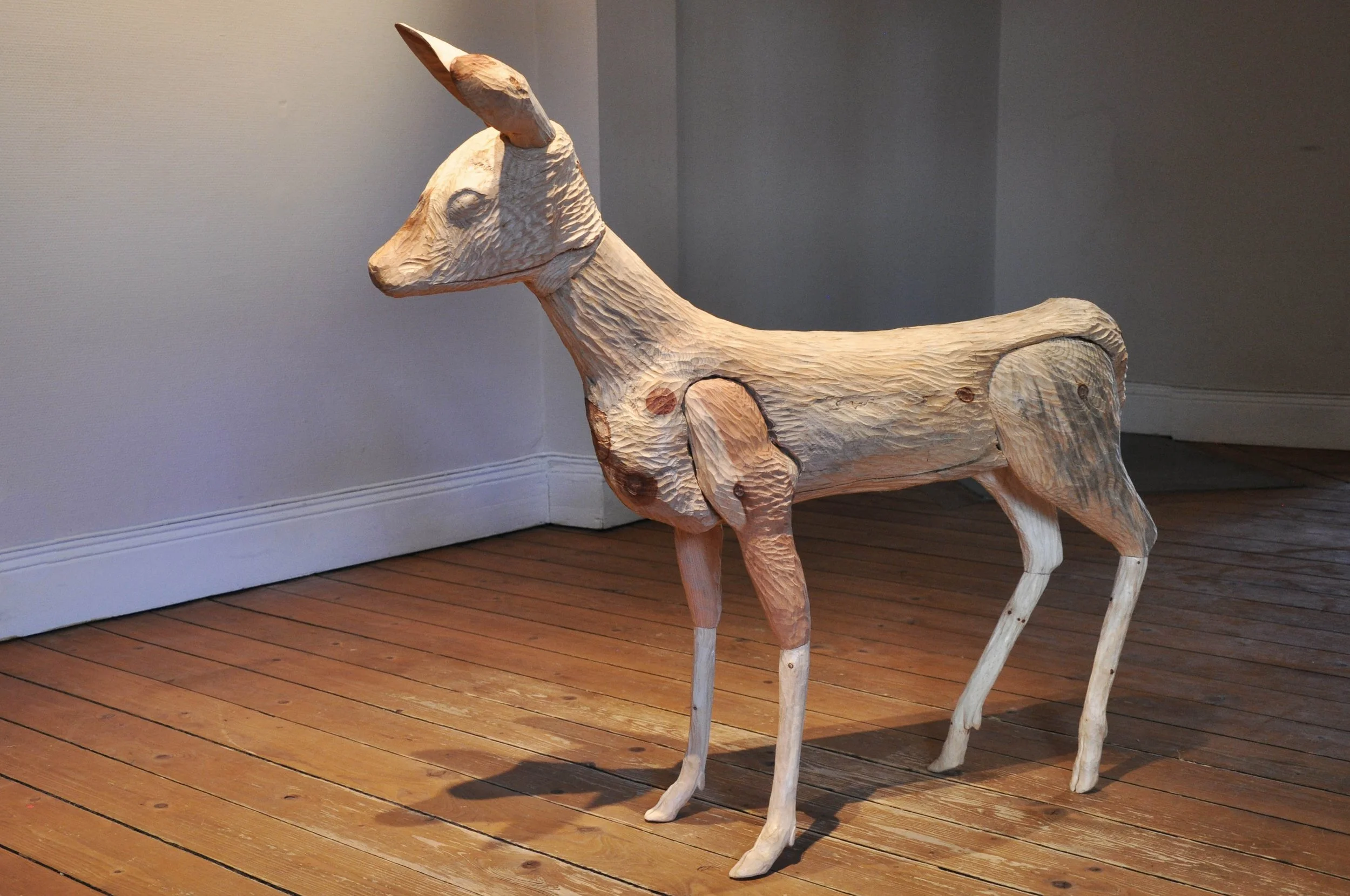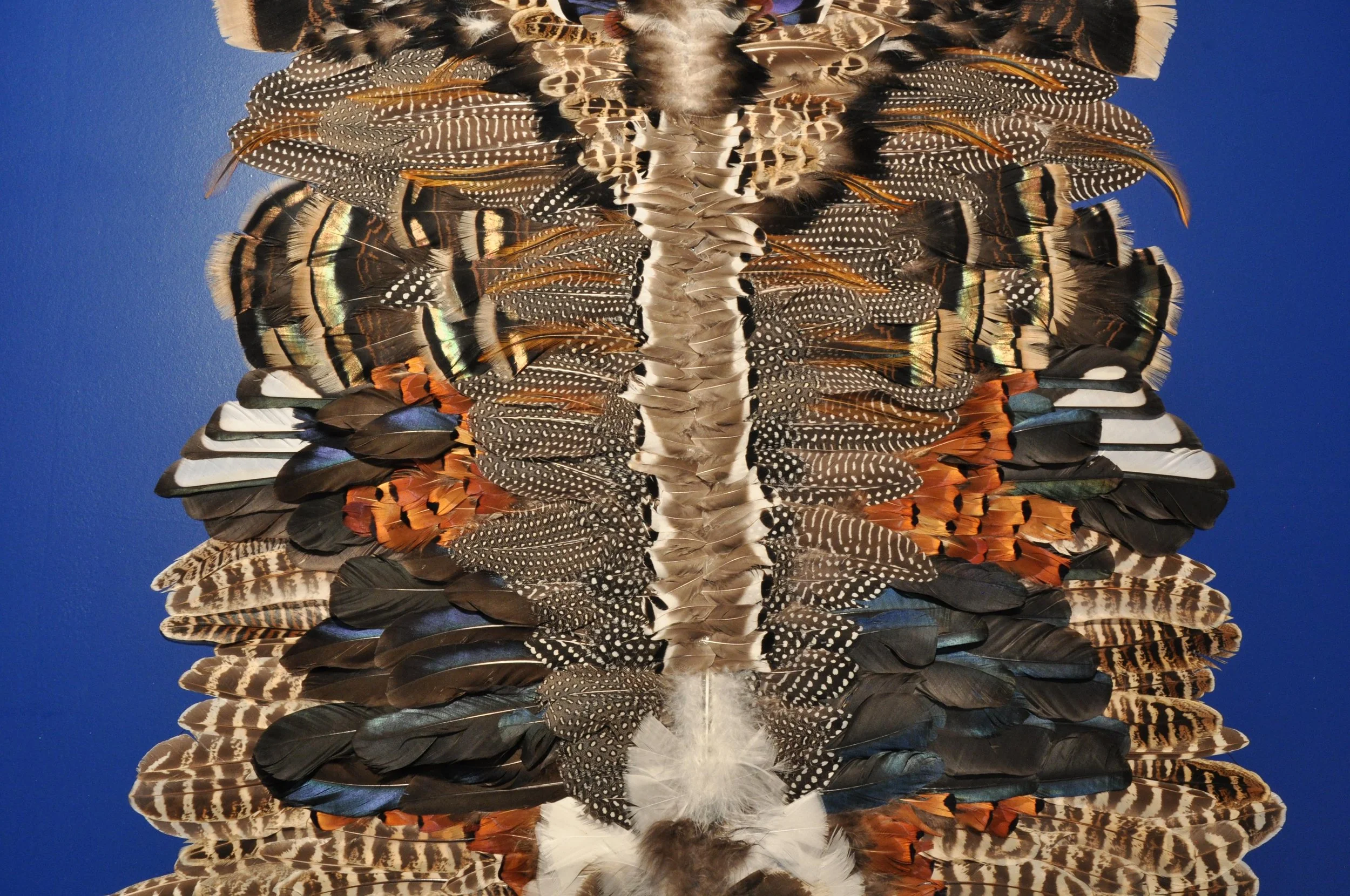 I some times uses repetition as a method to investigate the meaning of events and objects. Two photos taken by my mother in the 80s is hanging next to the tools and depicts a child fascinated studying her father in the process of skinning a deer. Inside the back room of the gallery, another 1:1 scale deer, made of wood, stands in front of an altar-like collage made of feathers. The wooden deer, like the photo, both become frozen momentary events. They carry a desire to be able to stop time and save it as photos in an album. The collage with a deep blue background was shown for the first time in 2016 at Galleri Verkligheten in Umeå as part of the exhibition Skogen behöver att jag ser den (The forest needs to be seen).