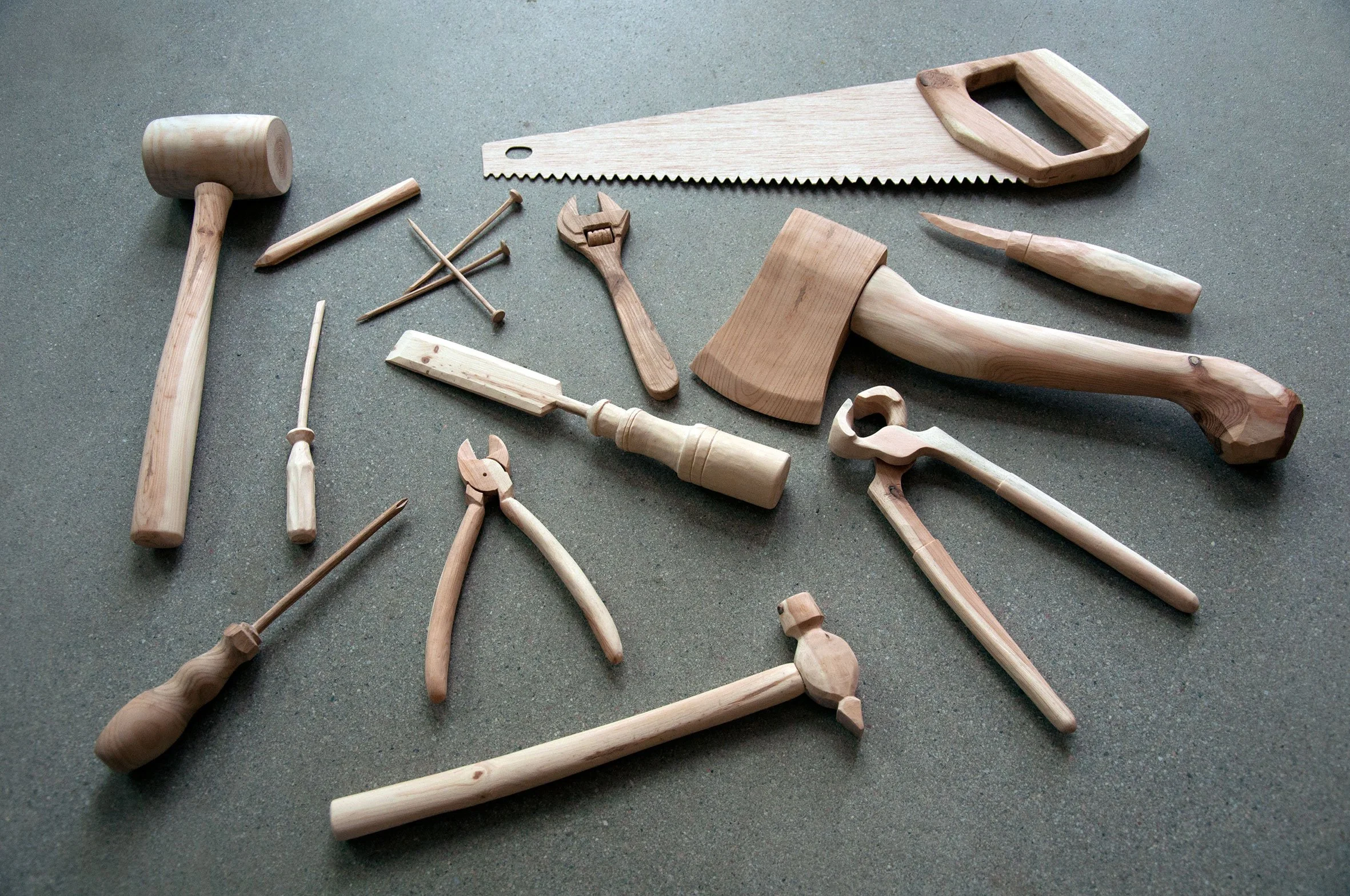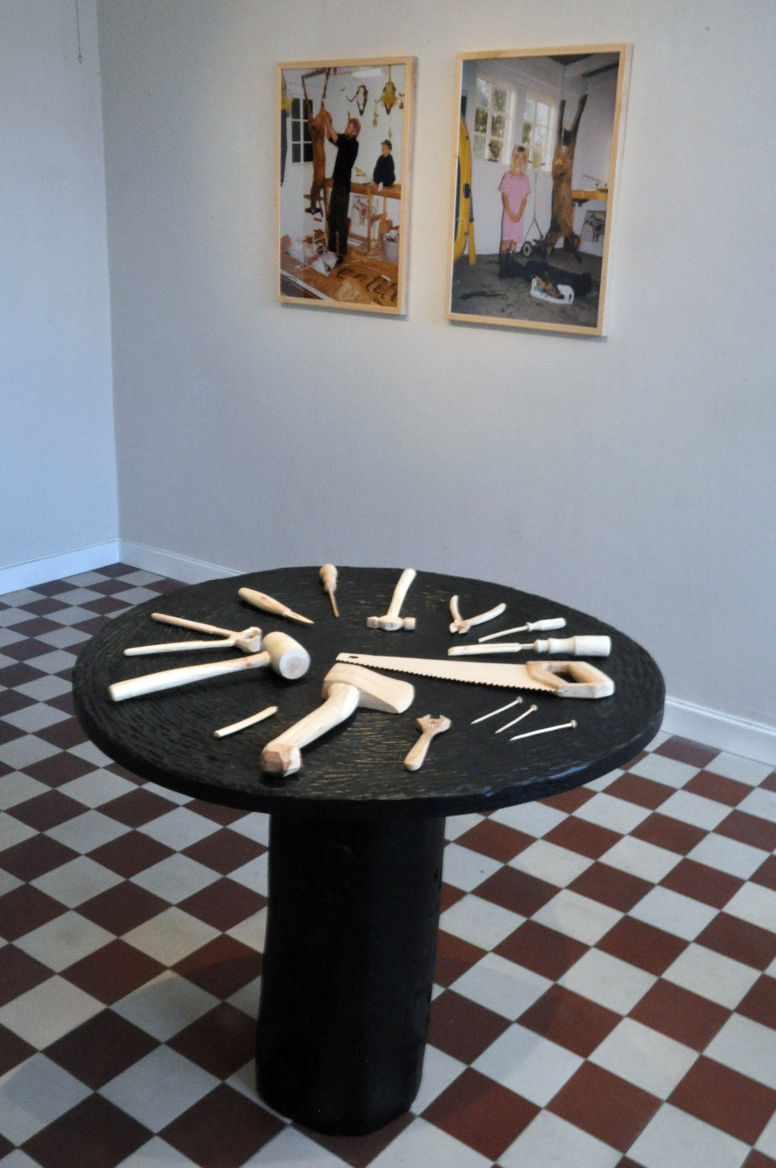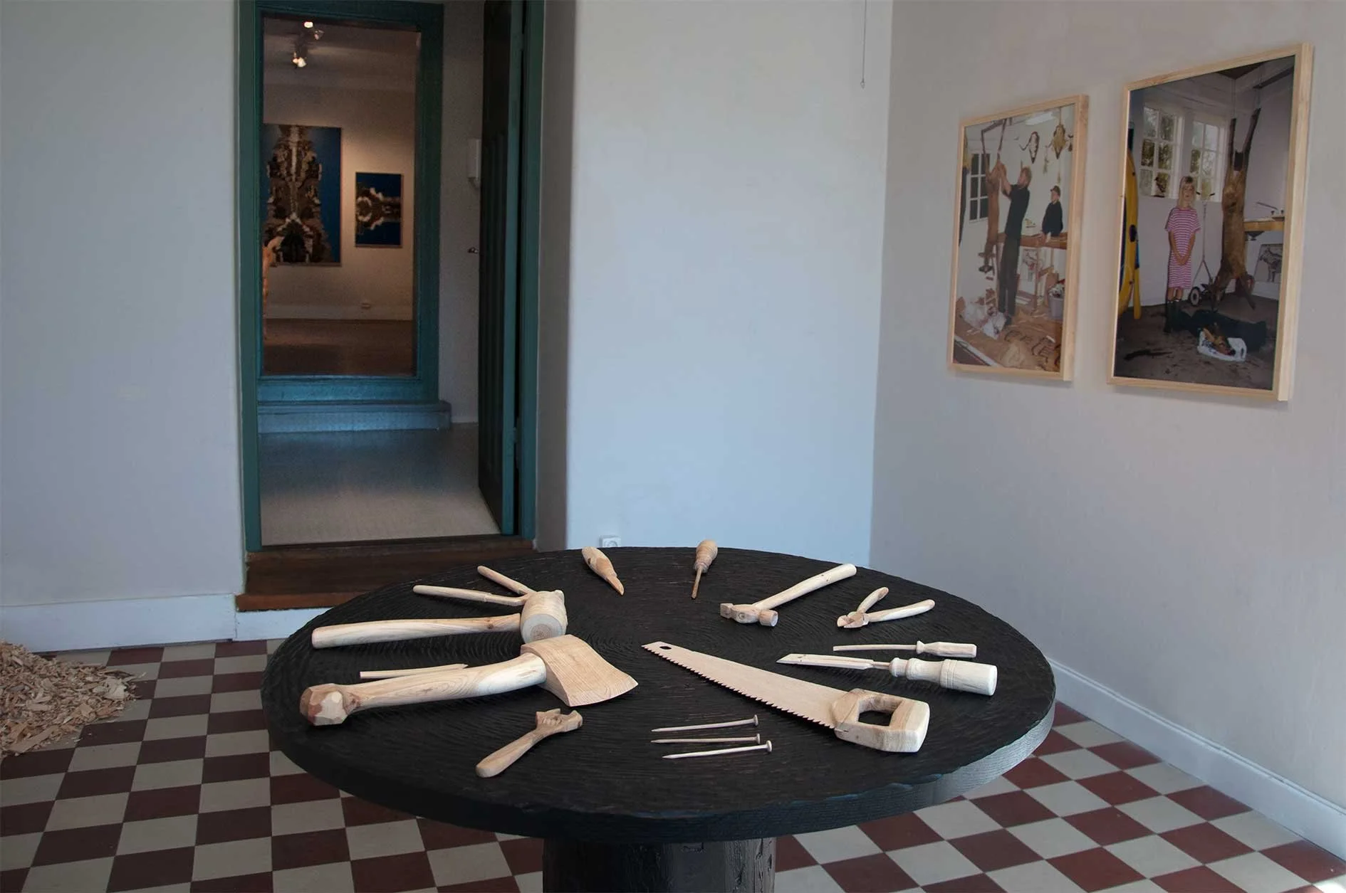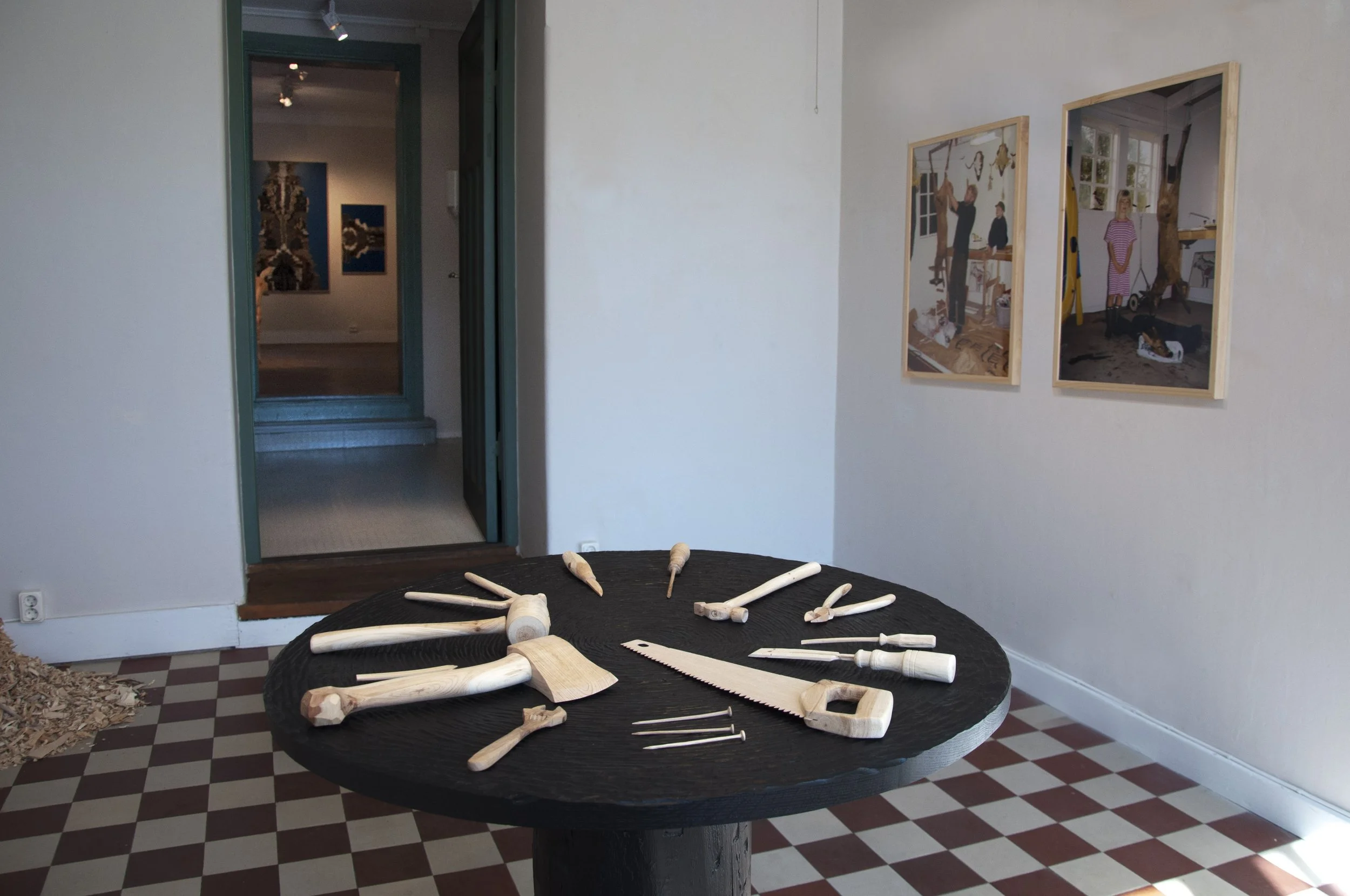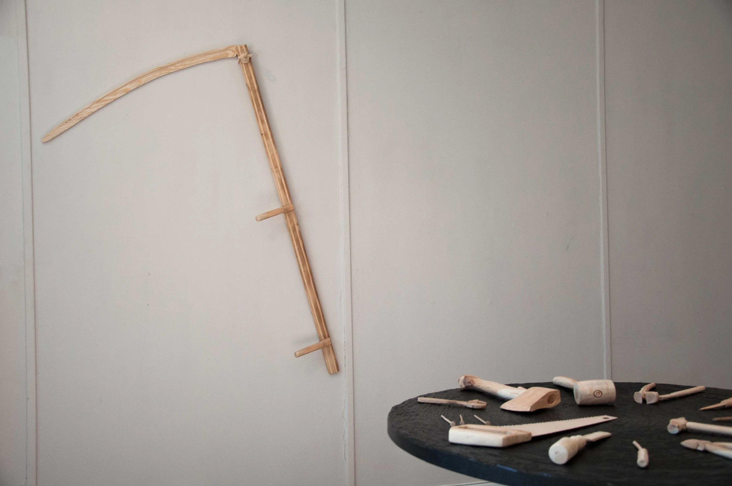Part of the exhibition is the new work Du kan bara rädda det du älskar (You can only save that which you love), consisting of tools carved in wood. They are replicas of tools inherited from my grandfather that in their wooden form lost their function. Creating these objects became a way for me to learn a craft that is no longer passed down in my family, while the tools' lack of function clarifies an emotional value that is easy to lose in the era of disposability. The axe becomes a portrait of something missing and maybe soon forgotten.